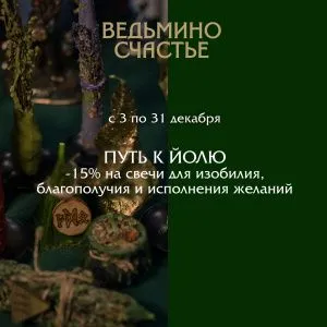 С 3 по 31 декабря особая йольская скидка 15% на сильные программные свечи для привлечения изобилия — чтобы следующий год встречал вас щедро, благополучия — чтобы в доме царили мир и гармония, счастья — чтобы найти его в простых моментах и больших свершениях и свечи для активации Силы Желания — чтобы ваша воля стала стрелой, летящей прямо в цель.