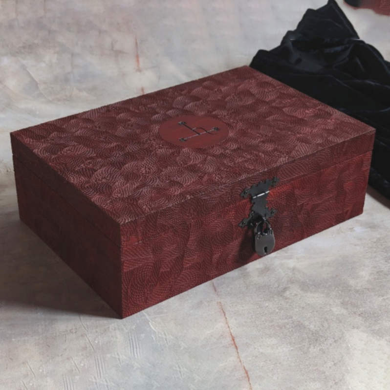 Каждая грань сундучка покрыта загадочным узором змеиной чешуи, напоминая о мудрости, искушении и вечном цикле перерождения. Этот узор приятно ощущается под пальцами, погружая в медитативное состояние перед сеансом. На крышке, словно оберег, выгравирована сама Печать Лилит — символ независимости, тайного знания и силы, стоящей у истоков мироздания.