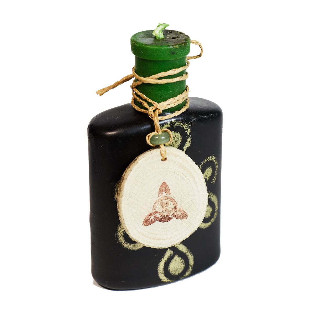 Свеча "Ведьмина бутылочка" на богатство - авторская двухцветная свеча. Внешний слой — матовый черный воск. Внутренний стержень — темно-зеленого цвета. Эта свеча – ваш ключ к финансовому благополучию, работает по принципу денежной ведьминой бутылочки, сжигая ограничения и притягивая потоки изобилия. По мере того как пламя расплавляет черную оболочку, оно открывает доступ к зеленой энергии роста и денег, помогая вам отпереть дверь к новым возможностям и прибыльным идеям. Амулет с нанесенным кельтским символом Трикветр (символ единства и изобилия) и зеленым авантюрином залогом вашего финансового успеха.