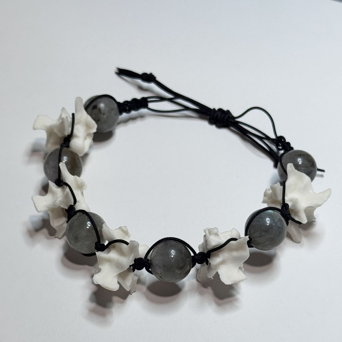 - Материалы:позвонки змеи, лабрадорит, вощёный шнур